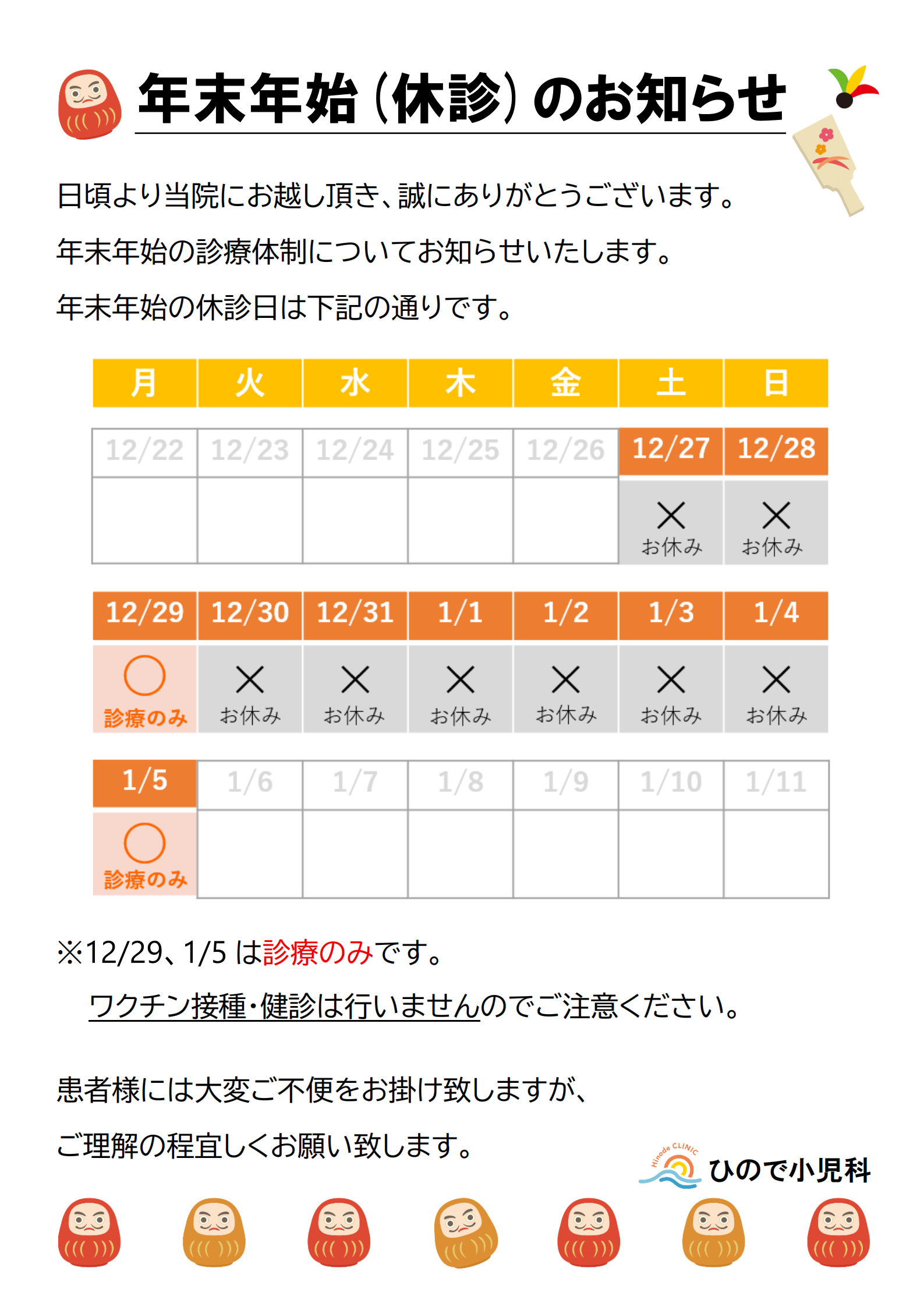 年末年始(休診)のお知らせ