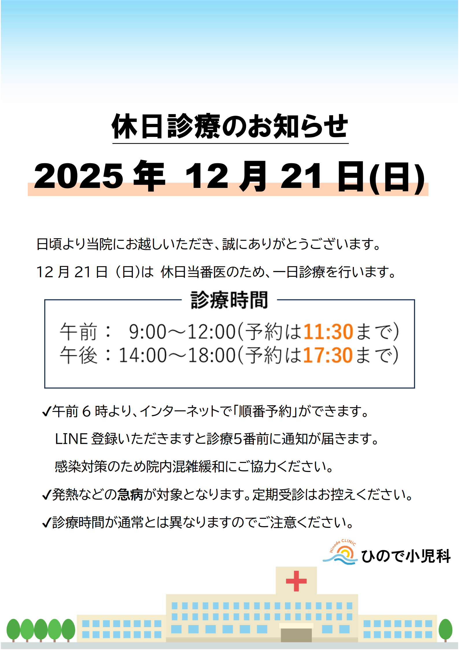 12月21日(日)は日曜祝日当番医のため、一日診療を行います。